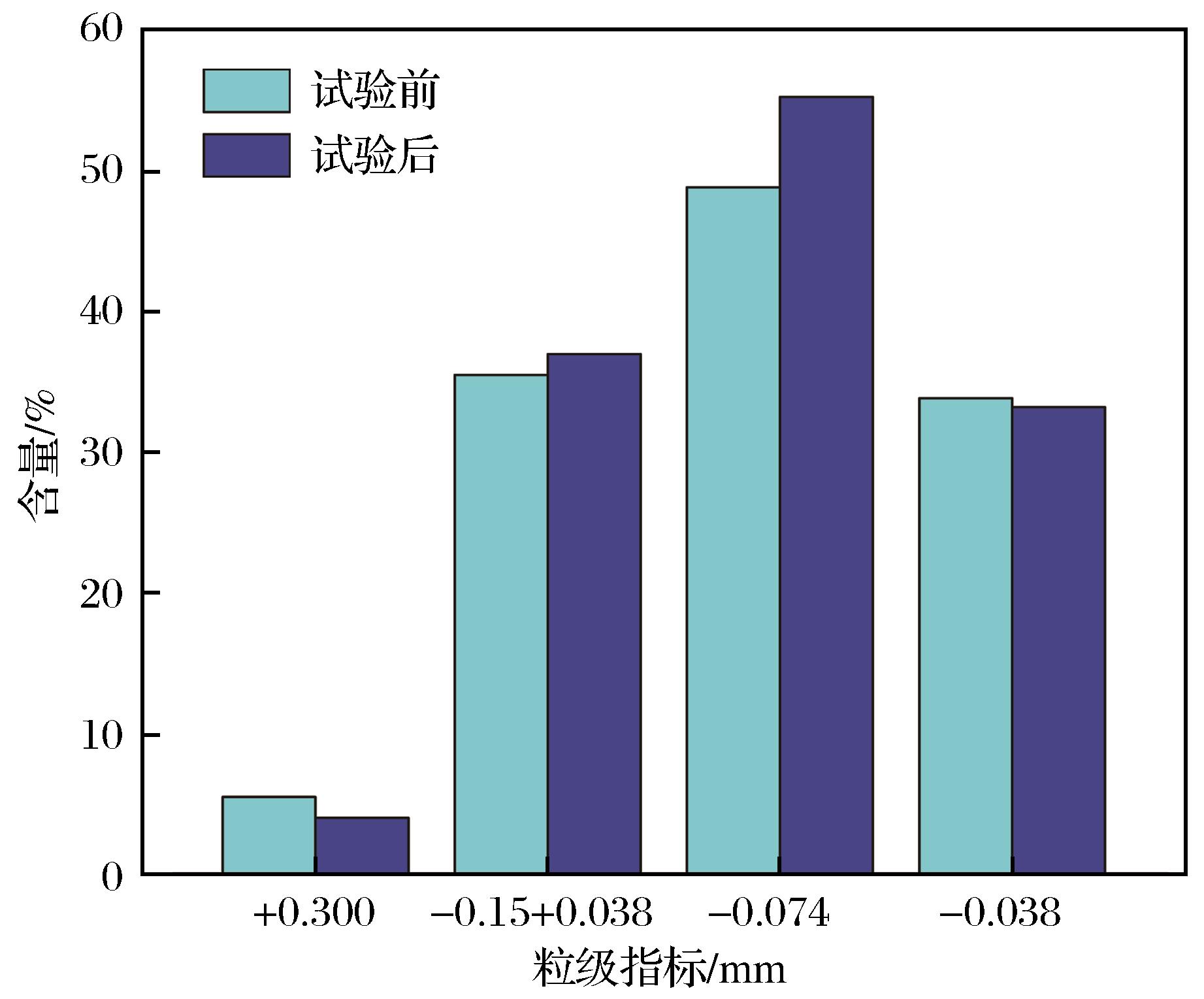 | 图2 试验前后3#球磨机磨矿溢流产品的粒级指标比较 |