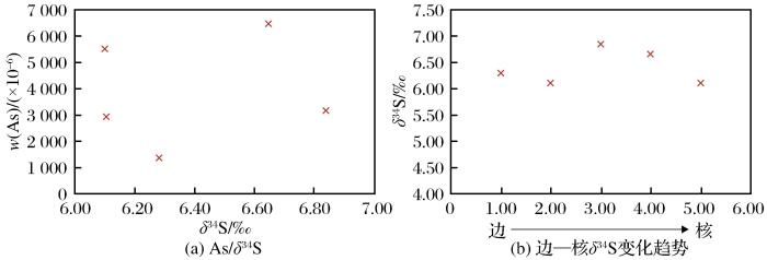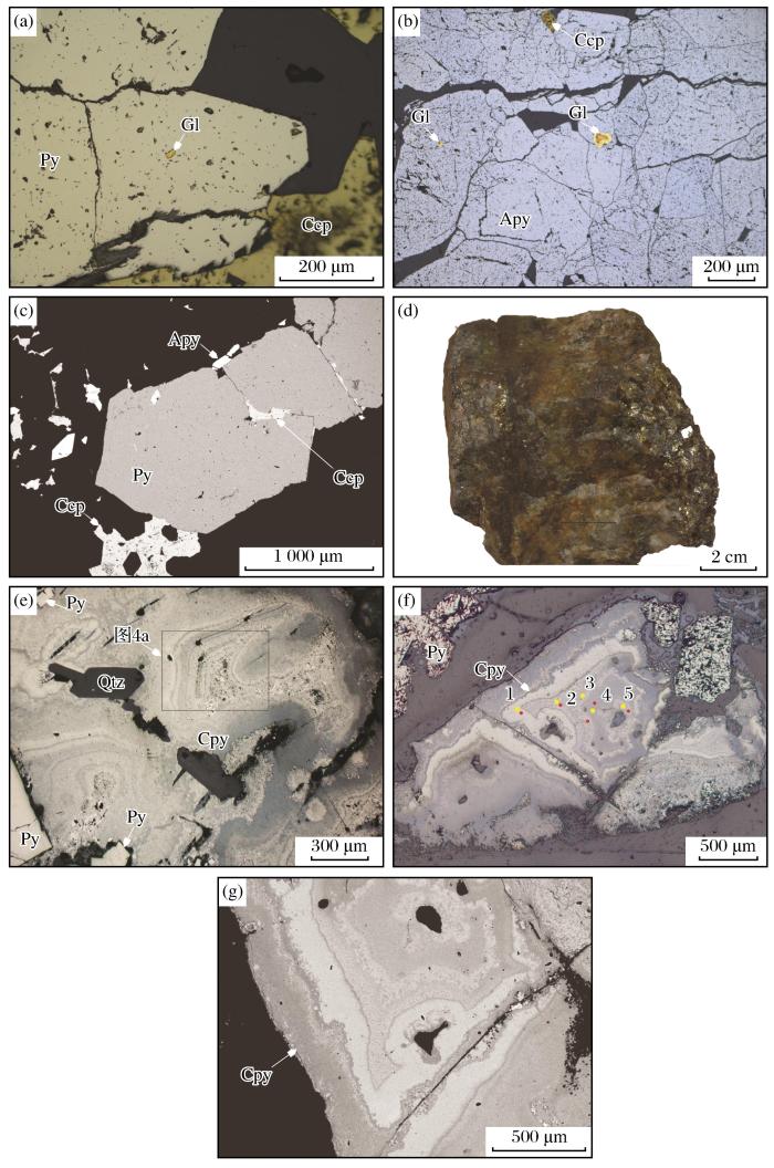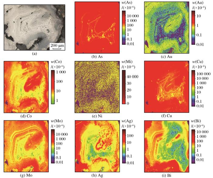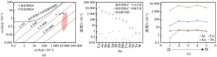 ... ).阿斯哈金矿的胶状黄铁矿微观结构类似于铜陵矿集区热液成因的胶状黄铁矿,该黄铁矿为低温热液产物,是物理化学条件骤变引起含矿热液过饱和结晶形成的(任云生等,2006).前人关于胶状黄铁矿的研究仅局限于矿物学的研究,即微区矿物组成、微形貌和微结构等特征研究(徐亮等,2019;谢巧勤等,2014),缺少反演黄铁矿沉淀时的物理化学条件变化以及物质来源特征的相关工作,进而制约了对胶状黄铁矿的成因和成矿作用过程的理解.黄铁矿的原位微量元素和面扫分析可以直观地呈现其在沉淀过程中微量元素迁移变化特征,从而反演当时的物理化学条件变化,而黄铁矿的硫同位素组成可为其物质来源提供有力的证据. ...
