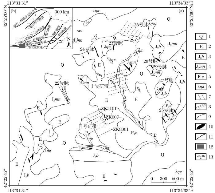 1.第四纪;2.第三纪;3.白音高老组火山岩系;4.玛尼图组火山岩系;5.额里图组沉积碎屑岩系;6.二长花岗斑岩;7.矿脉;8.勘探线;9.地质界线;10.矿化石英脉;11.断裂带;12.研究区位置;13.钻孔位置及编号