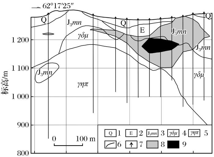 1.第四纪;2.第三纪;3.玛尼图组火山岩系;4.花岗闪长斑岩;5.二长花岗斑岩;6.岩性界线;7.钻孔;8.矿体(金品位>0.5×10-6);9.矿体(金品位>10×10-6)