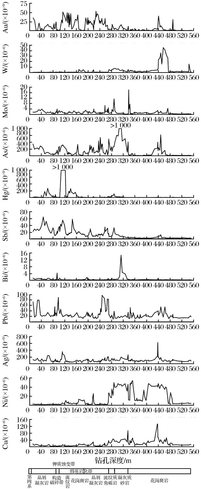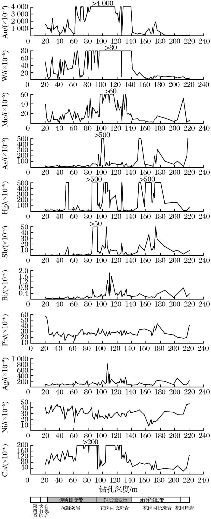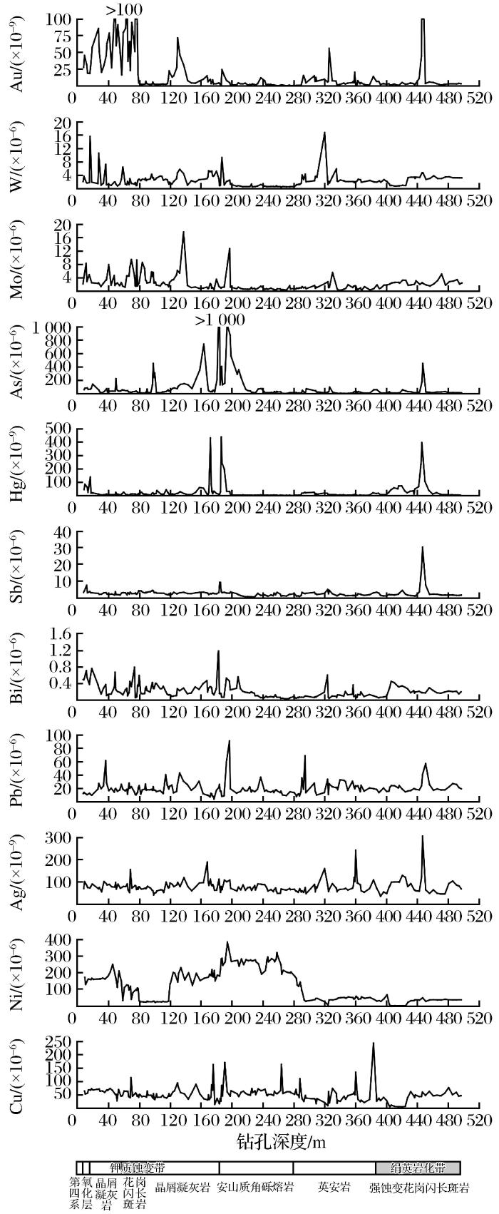 从各元素的空间分布趋势以及不同钻孔深度所对应的岩性柱状图(图4)来看,在孔深20~80 m之间出现了明显的Au、W、Mo异常,该处Au异常在整个钻孔中强度最高,多数岩(矿)石样品金含量超过50×10-9,异常分布范围大且连续性好,与其对应的W、Mo异常连续性较差,异常强度中等,与Au异常相对应位置,并未发现其他伴生元素异常。在孔深120~150 m之间出现了明显的Au异常,异常强度中等,分布范围较窄,相同位置仅出现明显的Mo异常和微弱的W异常,其他伴生元素无明显异常显示。在孔深170~200 m之间仅出现了金含量10×10-9左右的Au异常,异常强度弱,与其对应位置出现了异常强度较高的低温元素As、Hg多点异常,高温元素Wo、Mo、Bi也出现了明显的单点异常。在孔深440~460 m之间出现了明显的Au、As、Sb、Hg多点异常,高温元素W、Mo无异常显示。