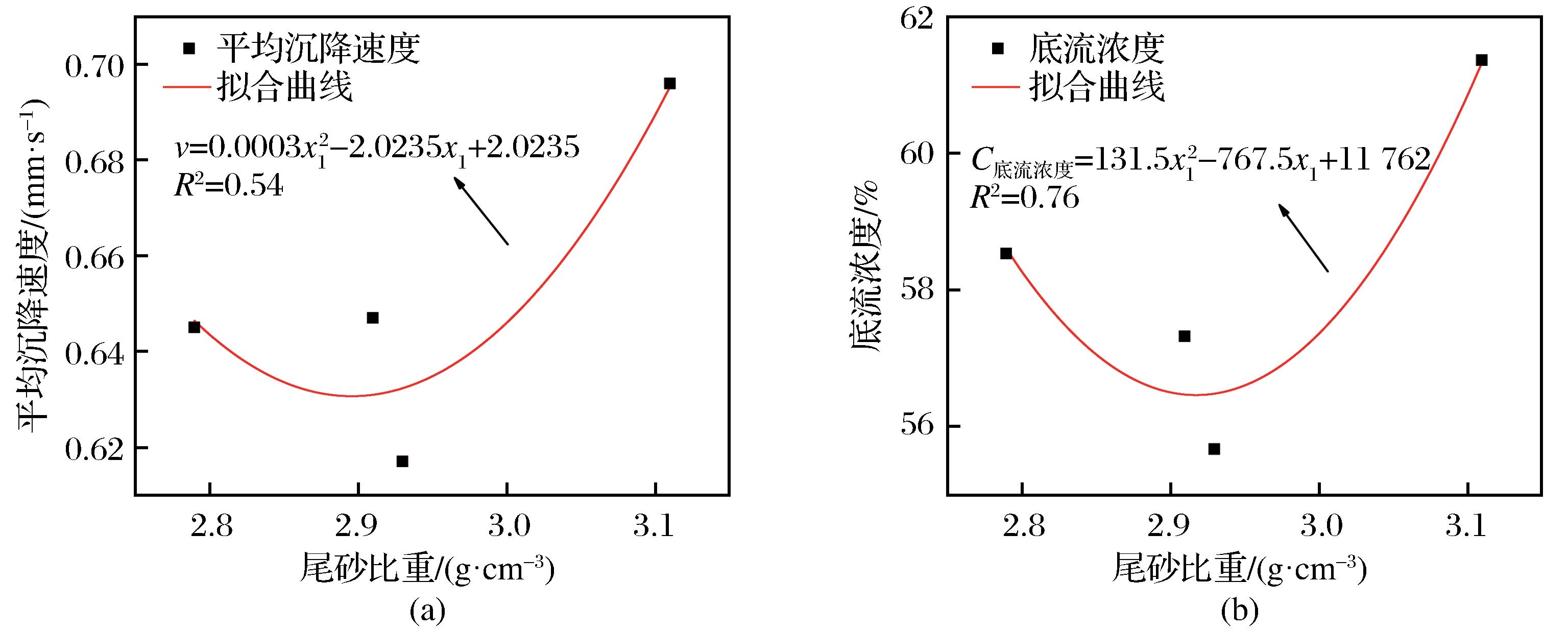| 图5 平均沉降速度(a)和底流浓度(b)随尾砂比重的变化规律 |