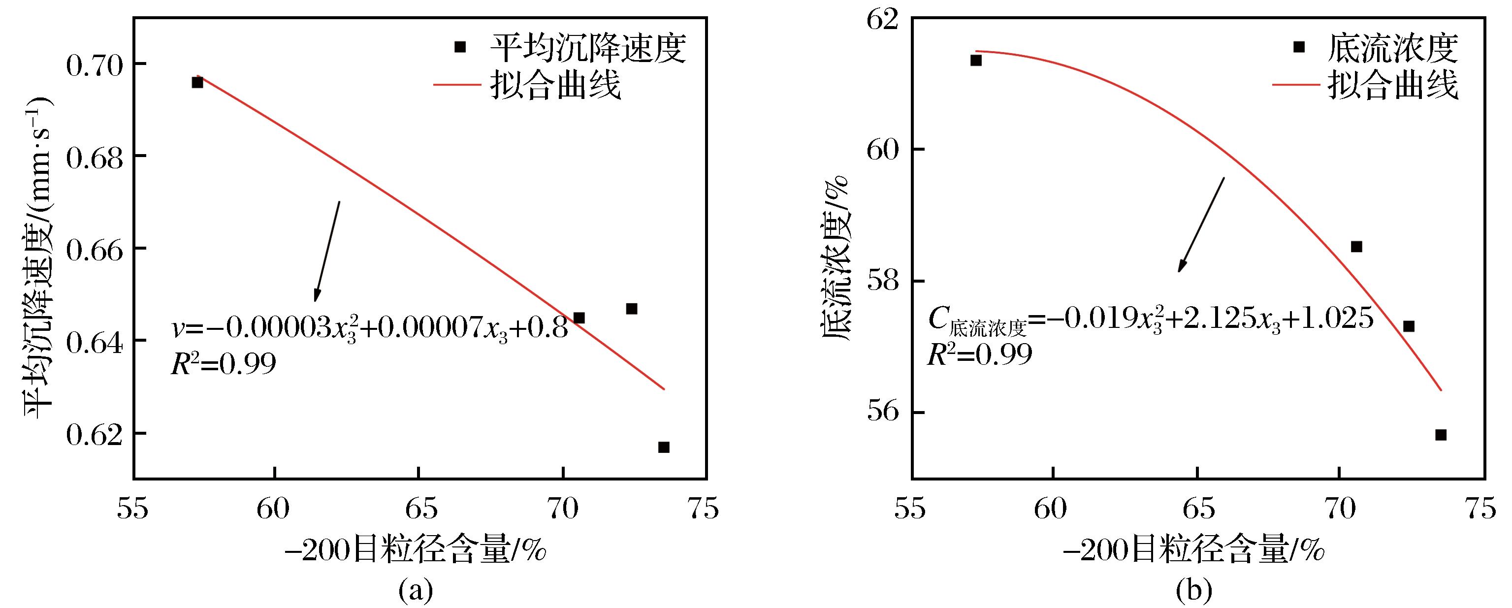 | 图7 -200目颗粒含量对平均沉降速度(a)和底流浓度(b)的影响 |