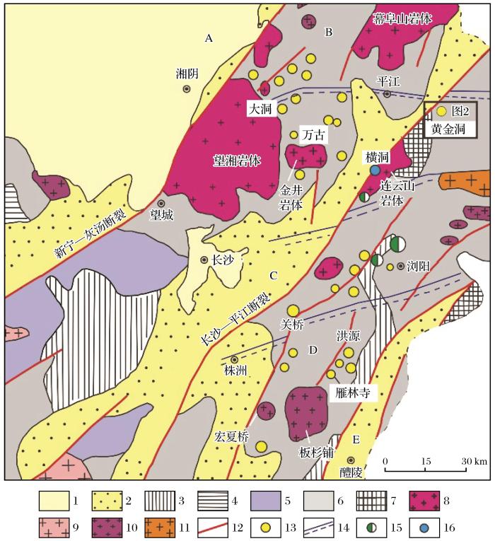 1.第四系;2.白垩纪—古近纪砂岩、砾岩和杂砂岩;3.中泥盆世—中三叠世碳酸盐岩、砂岩和泥岩;4.震旦纪—志留纪砂岩、页岩、砾岩和板岩;5.新元古代板溪群碎屑沉积岩;6.新元古代冷家溪群浅变质浊积岩;7.新太古代—古元古代(?)连云山岩群和涧溪冲岩群角闪岩相—麻粒岩相变质岩;8.燕山期花岗岩;9.印支期花岗岩;10.加里东期花岗岩;11.新元古代花岗岩;12.断层;13.金矿床或矿化点;14.韧性剪切带;15.Cu-Pb-Zn-Au矿床;16.Co矿床; A-汨罗断陷盆地;B-幕阜山—望湘断隆;C-长沙—平江断陷盆地;D-浏阳—衡东断隆;E-醴陵—攸县断陷盆地