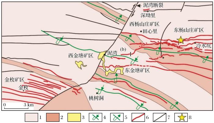 1.新元古代小木坪组第二段;2.新元古代小木坪组第一段;3.第四系;4.倒转向斜;5.倒转背斜;6.金矿脉;7.断裂;8.取样位置