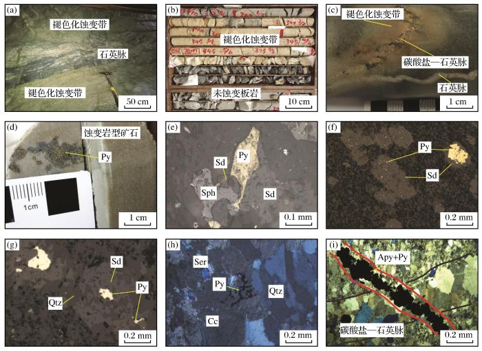 (a) 与含矿石英脉相邻的褪色化蚀变带;(b) 褪色化蚀变带的颜色变化;(c) 碳酸盐—石英脉两侧对称的褪色化蚀变带;(d) 含金蚀变岩;(e) 黄铁矿切穿菱铁矿;(f) 浸染状黄铁矿位于菱铁矿附近;(g) 溶蚀的菱铁矿边缘局部被石英胶结;(h) 碳酸盐—石英脉由绢云母、方解石、石英、绿泥石和硫化物组成;(i) 碳酸盐—石英脉被含毒砂、黄铁矿的矿脉横切Apy-毒砂;Py-黄铁矿;Sd-菱铁矿;Sph-闪锌矿;Qtz-石英;Cc-方解石;Ser-绢云母