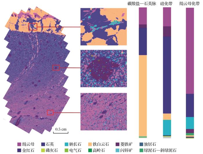 野外和钻孔编录可观察到褪色化蚀变带在石英脉两旁呈对称分布,在此基础上,利用TIMA在该样品中观察到2个蚀变带,碳酸盐—石英脉近端的蚀变带为硅化,远端的蚀变带为绢云母化。近端硅化蚀变带以石英(59%)、钠长石(11%)和菱铁矿(8%)为主,菱铁矿主要赋存于碳酸盐—石英脉与含金蚀变岩的接触部位。远端绢云母化蚀变带由绢云母(65%)、石英(17%)、钠长石(9%)以及少量菱铁矿(4%)和绿泥石—斜绿泥石(2%)组成。等粒径石英—绢云母—钠长石组合为蚀变板岩的基质。