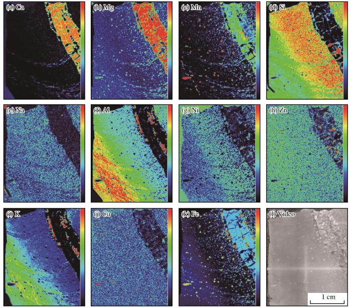 (a)~(k) μ-XRF元素填图;(l) 对应的薄片照片