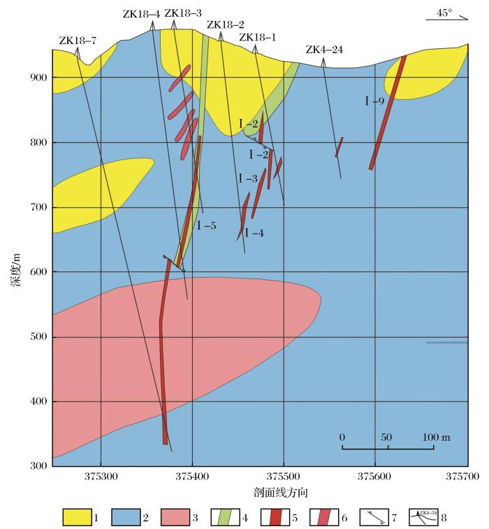 1.斜长角闪片麻岩;2.绢云母化含石墨斜长片麻岩;3.大理岩;4.闪长玢岩脉;5.矿体;6.硅化脉;7.断层;8.钻孔位置及编号
