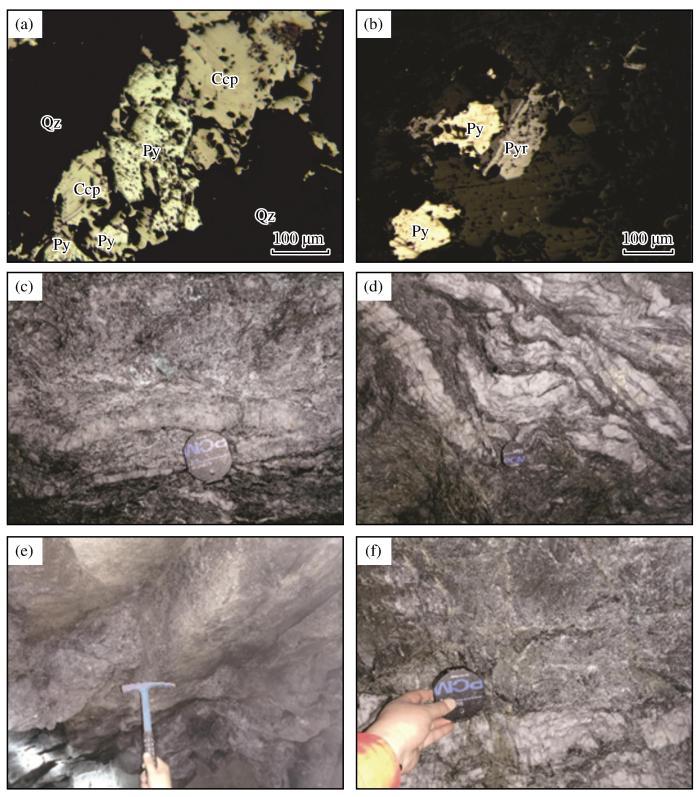 (a)石英脉型矿石结构;(b)蚀变岩型矿石结构;(c)石英型矿体;(d)石英型矿体形成的揉皱;(e)蚀变岩型矿体;(f)石英脉型矿体插入蚀变岩型矿体中; Py-黄铁矿;Pyr-磁黄铁矿;Ccp-黄铜矿;Qz-石英