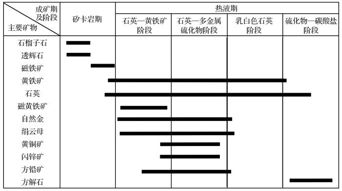 根据不同的蚀变矿物组合及其嵌布关系,将柴胡栏子金矿成矿作用过程划分为2期5个阶段(图5)。矽卡岩期:主要矿物有石榴石、透辉石和磁铁矿,还有少量的石英和黄铁矿,主要表现为基性岩脉的金矿化(矿化很弱),极少能达到工业品位。热液期:依据矿脉的穿插关系、矿物组合及矿石结构构造特征,划分为4个阶段。石英—黄铁矿阶段:主要矿物有黄铁矿和石英,还有少量的绢云母、磁铁矿、自然金和方铅矿,本阶段矿石主要呈稀疏浸染构造,其中黄铁矿多呈半自形—他形结构,粒度较小,一般为100~300 μm;石英多呈白色块状。石英—多金属硫化物阶段:主要矿物有黄铁矿、磁黄铁矿、石英、自然金、绢云母、黄铜矿、闪锌矿和方铅矿,该阶段为主成矿阶段。矿石矿物多呈细脉状、网脉状和团块构造,穿插石英—黄铁矿阶段。黄铁矿形态复杂,呈自形—半自形—他形,粒径一般为300~500 μm不等,主要集中在10~200 μm,局部可见黄铁矿交代磁黄铁矿;石英多呈烟灰色。乳白色石英阶段:主要矿物有石英,还有少量的黄铁矿和绢云母。该阶段分布局限,仅在上述2个阶段的局部矿石中呈细脉状叠加。硫化物—碳酸盐阶段:主要矿物为方解石,还有少量的黄铁矿和石英等,该阶段不成矿,主要叠加在上述成矿阶段的构造裂隙发育部位。