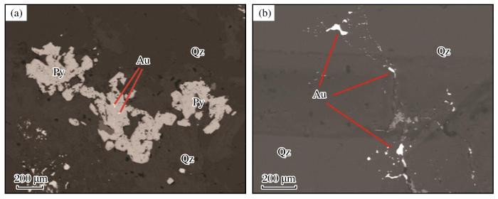 (a)自然金赋存在黄铁矿中;(b)自然金赋存在石英及其裂隙中;Py-黄铁矿;Qz-石英