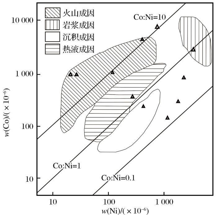 黄铁矿Ni-Co图解(底图据Brill et al.,1989;Bajwah et al.,1987)