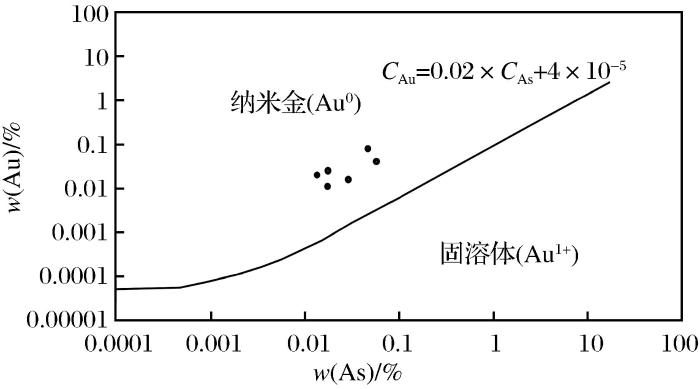 前人研究发现,黄铁矿中As和Au元素并非呈现一般的线性关系,某种程度上As元素的富集对于Au进入黄铁矿具有积极作用。其原因是,当黄铁矿中发生了As和S元素的类质同像替代时,会使得黄铁矿的晶体结构变得不稳定,处于亚稳定状态,这时Au元素就会更容易进入黄铁矿晶格。在含As元素的黄铁矿中,存在一个Au的固溶极限,该极限可以通过CAu=0.02×CAs+4×10-5来表示,其中CAu和CAs表示Au和As元素的浓度,位于该极限下方的Au主要是固溶体,而超过极限的Au则是以纳米金(Au0)形式存在。由柴胡栏子金矿黄铁矿w(Au)-w(As)关系图(图9)可以看出,该金矿床中黄铁矿的Au主要是以纳米金(Au0)形式存在,纳米金(Au0)的沉淀意味着成矿热液形成的环境为还原环境,且Au为饱和状态。