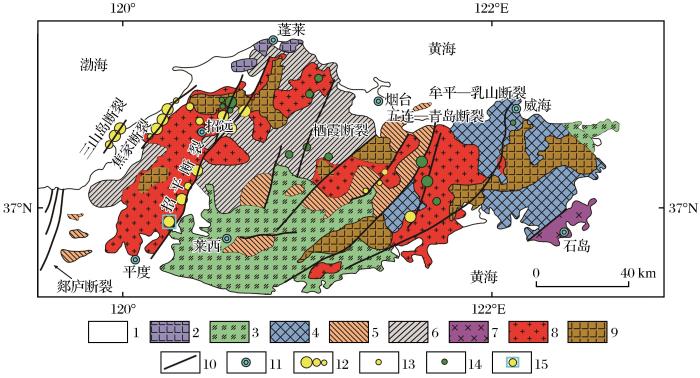 1.第四纪沉积物;2.新生代玄武岩;3.白垩纪火山岩;4.苏鲁超高压变质岩;5.古生代荆山群和粉子山群;6.太古宙胶东群;7.三叠纪花岗岩;8.侏罗纪花岗岩;9.白垩纪花岗岩;10.断层;11.城市;12.大、中、小型金矿;13.蚀变岩型金矿;14.石英脉型金矿;15.曹家洼金矿