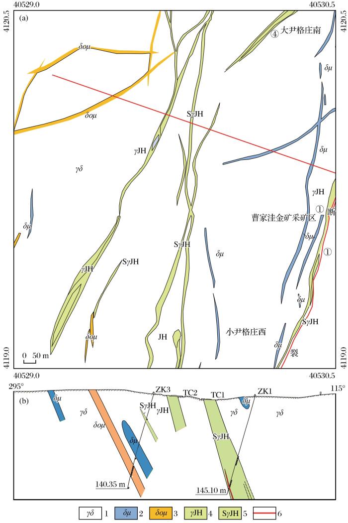 曹家洼金矿地质图(a)及0号勘查线剖面图(b)