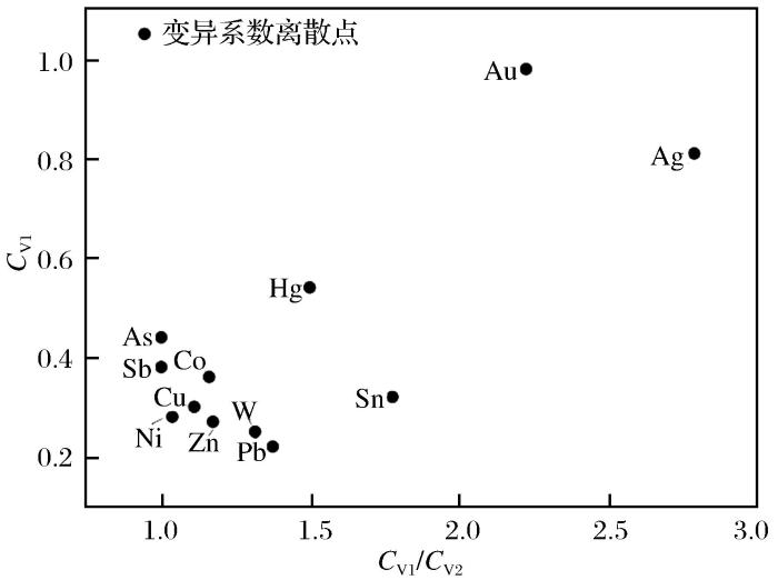 曹家洼金矿土壤地球化学测量元素变异系数离散图