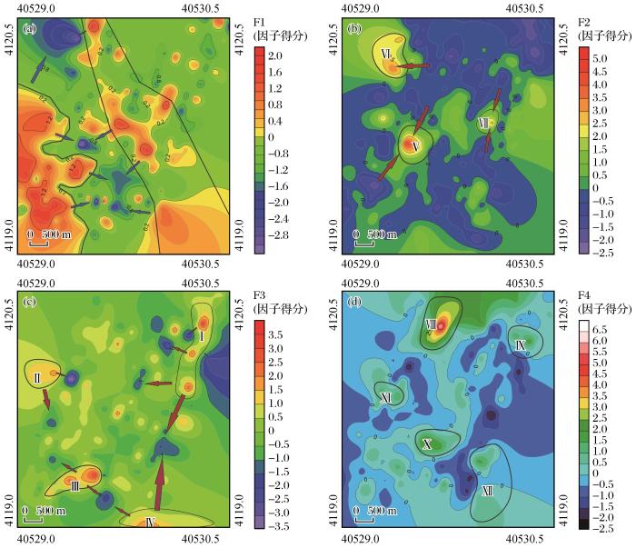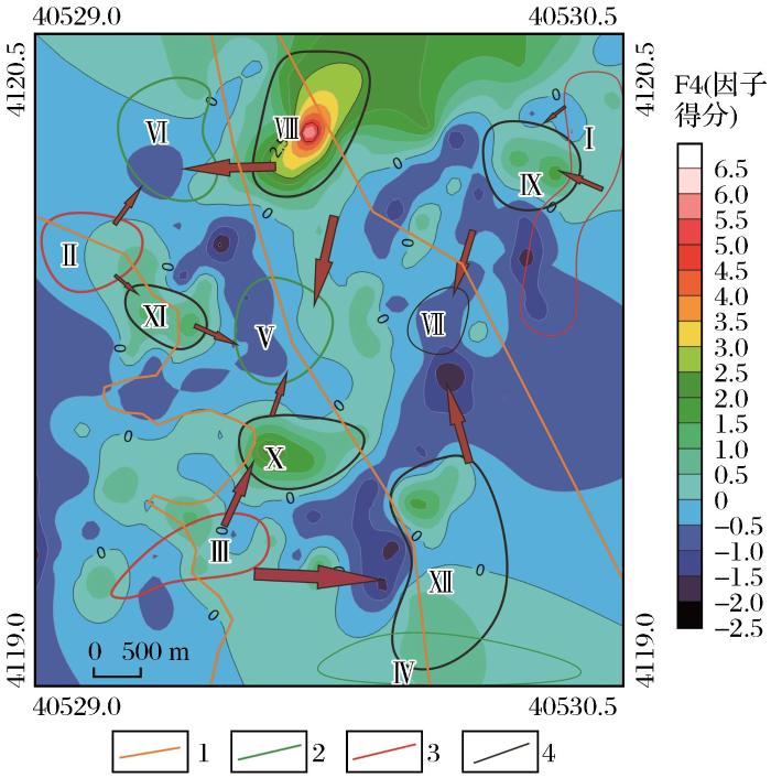 (3)在R型聚类分析及因子分析的基础上,绘制了石头顶矿段F1~F4因子等值线异常图,并划分了12个异常区域,包括:高温元素异常(Ⅰ~Ⅳ号)、中高温元素异常(Ⅷ~Ⅻ号)、中低温元素异常(Ⅴ~Ⅶ号)以及岩浆活动晚期的成岩元素异常。结合实际地质图,对石头顶矿段进行了靶区的划分。