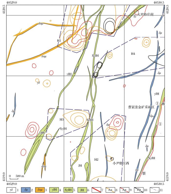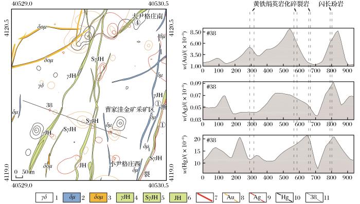 1.花岗闪长岩;2.闪长玢岩;3.蚀变石英闪长玢岩;4.黄铁绢英岩化花岗岩;5.黄铁绢英岩化碎裂岩;6.黄铁绢英岩;7.招平断裂带;8.Au等值线;9.Ag等值线;10.Hg等值线;11.38#勘探线