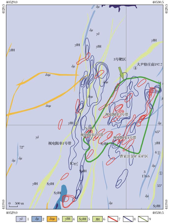 1.花岗闪长岩;2.闪长玢岩;3.蚀变石英闪长玢岩;4.黄铁绢英岩化花岗岩;5.黄铁绢英岩化碎裂岩;6.黄铁绢英岩;7.IP极化率异常;8.IP视电阻率率异常;9.靶区
