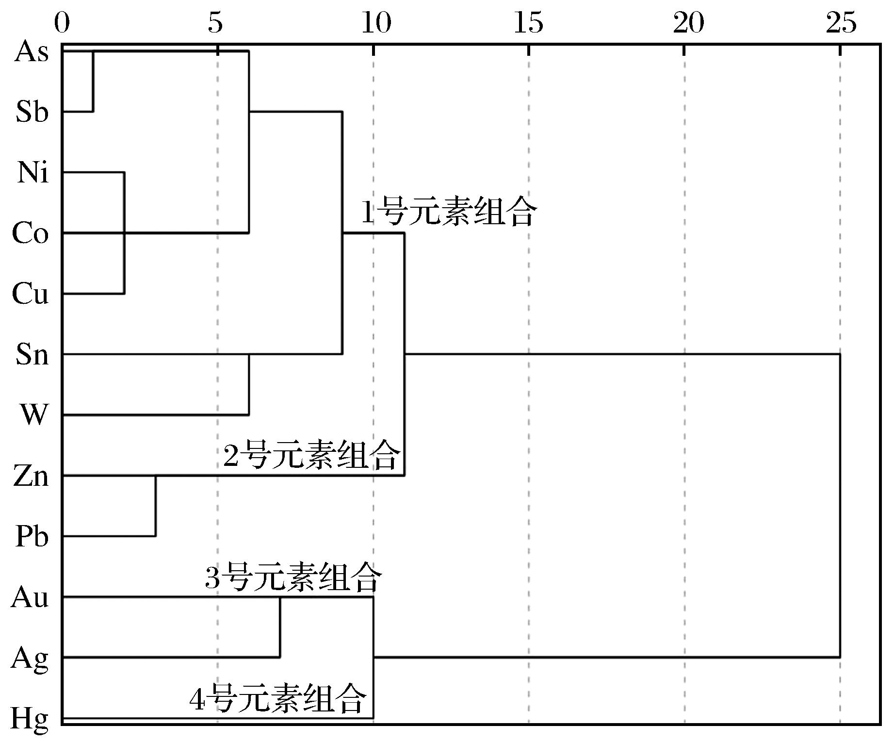 | 图4 曹家洼金矿土壤地球化学元素R型聚类分析谱系图 |