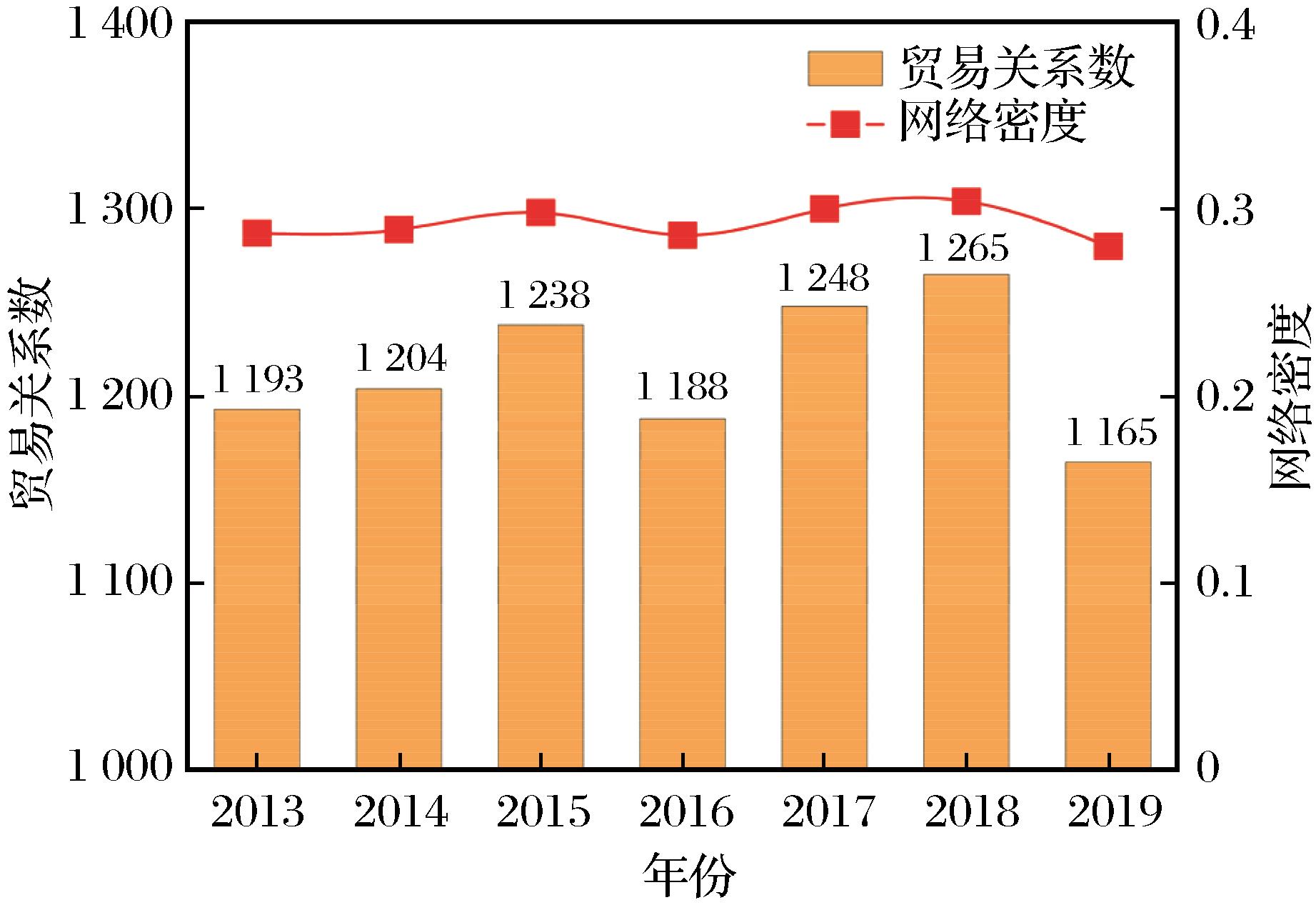 | Fig.3 Evolution process of rare earth trade relationship number and trade network density in the Belt and Road from 2013 to 2019 |