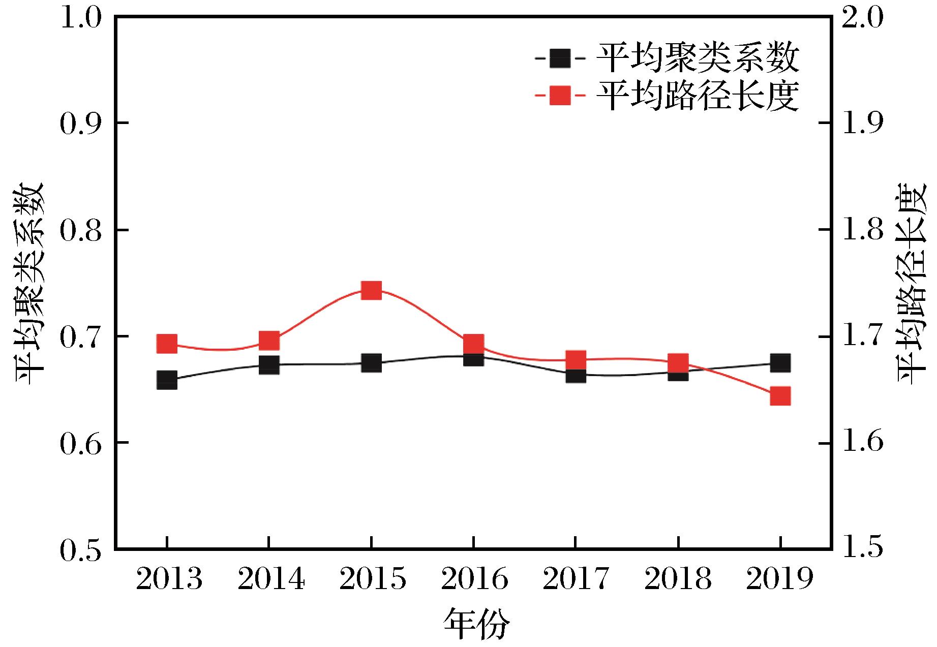 | 图4 2013—2019年“一带一路”稀土贸易网络的平均聚类系数与平均路径长度演化过程 |