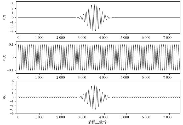 利用MATLAB2018b编码生成仿真信号,采用高斯脉冲信号和高频低幅信号合成来模拟含有噪声信号的声发射信号,仿真信号分为x1(t)、x2(t)和s(t)。其中,x1(t)为高斯脉冲信号;x2(t)为高频正弦信号,频率为10 Hz;s(t)为合成信号。