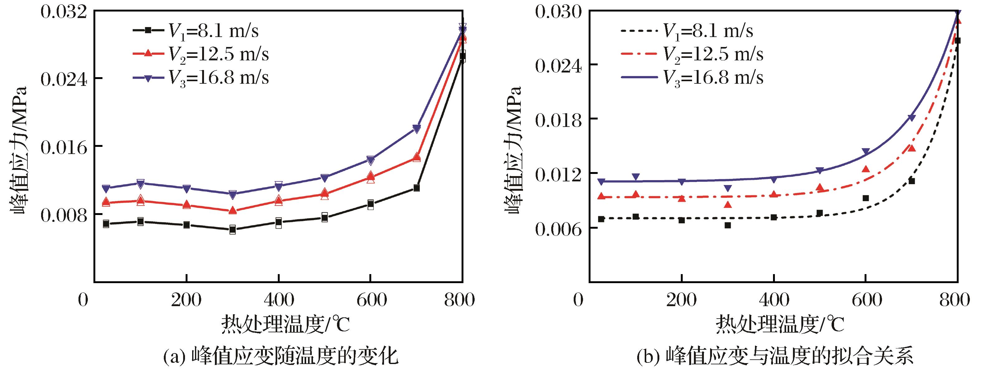 | Fig.8 Relationship between peak strain and temperature under different projectile velocities |
