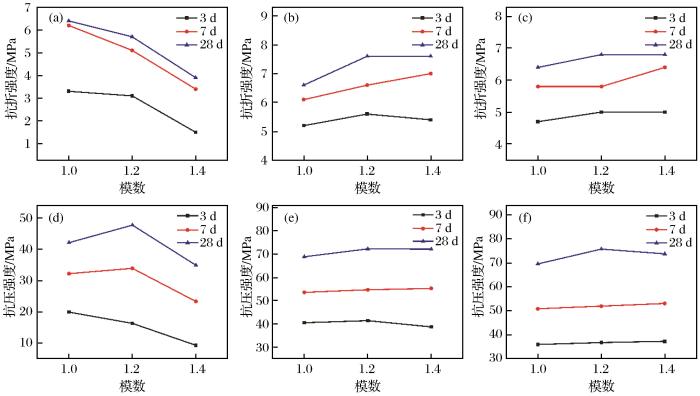 (a)碱掺量为10%时碱激发剂模数对抗折强度的影响;(b)碱掺量为15%时碱激发剂模数对抗折强度的影响;(c)碱掺量为20%时碱激发剂模数对抗折强度的影响;(d)碱掺量为10%时碱激发剂模数对抗压强度的影响;(e)碱掺量为15%时碱激发剂模数对抗压强度的影响;(f)碱掺量为20%时碱激发剂模数对抗压强度的影响