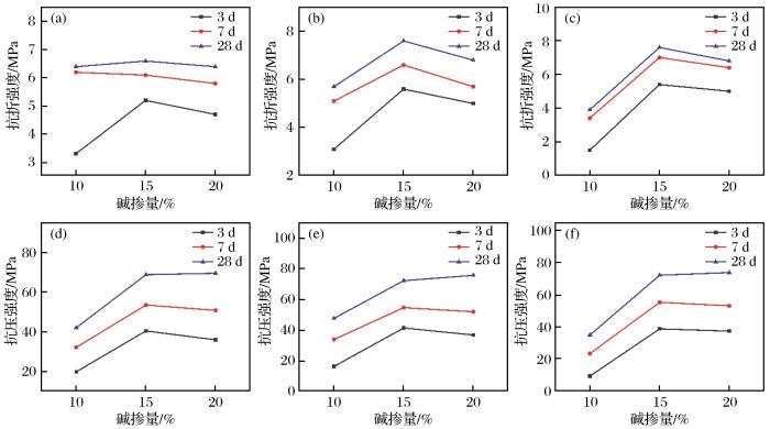 (a)碱激发剂模数为1.0时碱掺量对抗折强度的影响;(b)碱激发剂模数为1.2时碱掺量对抗折强度的影响;(c)碱激发剂模数为1.4时碱掺量对抗折强度的影响;(d)碱激发剂模数为1.0时碱掺量对抗压强度的影响;(e)碱激发剂模数为1.2时碱掺量对抗压强度的影响;(f)碱激发剂模数为1.4时碱掺量对抗压强度的影响