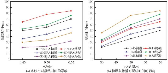 由图4(a)可知,地聚合物混凝土拌合物的初凝时间为21~70 min,终凝时间为30~84 min,与普通混凝土凝结时间相比要短得多。当水胶比从0.55下降为0.50和0.45时,70%FA组的初凝时间分别减少了20.0%和28.6%,50%FA组的初凝时间分别减少了20.0%和34.5%,30%FA组的初凝时间分别减少了28.1%和34.4%。结果表明,水胶比对凝结时间有显著影响,水胶比越低,凝结时间越短。这归因于水的减少可以加速地聚合物混凝土中的凝结过程,从而缩短凝结时间(Weng et al.,2007)。此外,水胶比与地聚合物混凝土的凝结时间几乎呈线性关系,过低的水胶比会导致凝结时间过短而不利于操作。