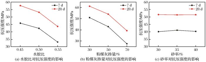 (3)水胶比的增大使抗压强度下降,当水胶比超过0.50时,抗压强度下降趋势明显。当粉煤灰掺量增加时,混凝土抗压强度几乎呈线性下降,当粉煤灰掺量超过50%时,抗压强度下降趋势更为显著。砂率的变化对抗压强度几乎没有影响。利用SPSS软件对正交试验进行方差分析,结果表明:粉煤灰掺量对抗压强度影响最为显著,水胶比次之,而砂率对强度发展几乎没有影响。