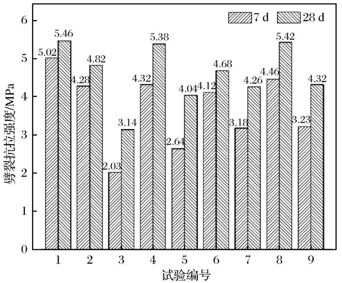 对标准养护7 d和28 d的混凝土试样进行劈裂抗拉强度测试,结果如图6所示。各组劈裂抗拉强度约为对应立方体抗压强度的10%,且随龄期的增加而逐渐增长。