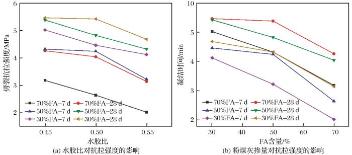 对标准养护7 d和28 d的混凝土试样进行劈裂抗拉强度测试,将水胶比和粉煤灰掺量作为自变量,劈裂抗拉强度作为因变量,探究各因素水平对混凝土抗拉强度的影响,结果如图7所示。