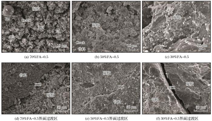 选取水胶比为0.50,粉煤灰掺量为30%、50%和70%的试样进行微观结构分析,如图8所示。