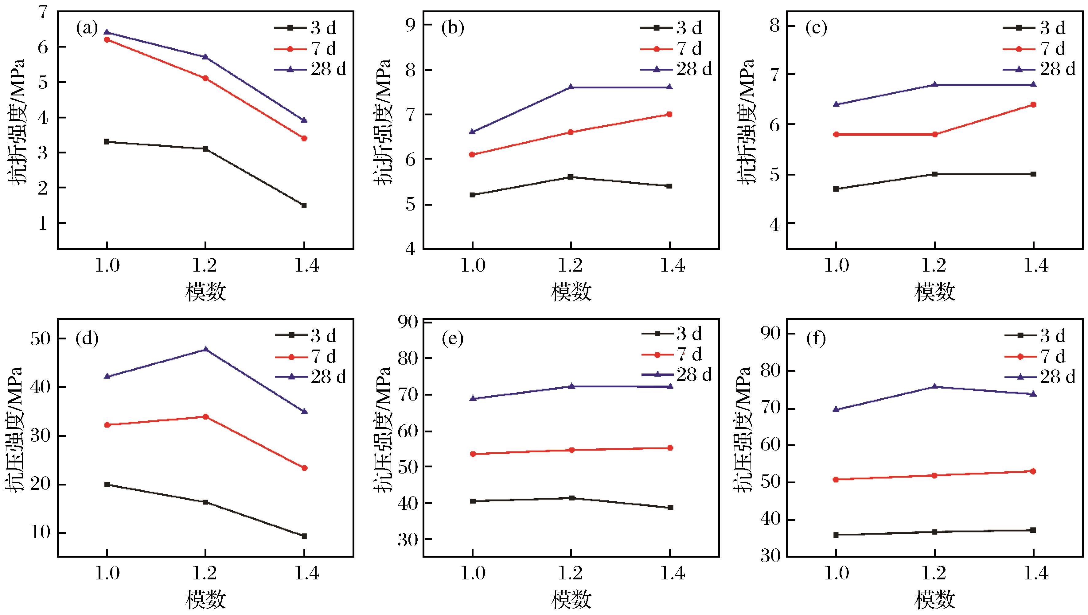 | 图1 不同碱激发剂模数胶砂的抗折强度和抗压强度 (a)碱掺量为10%时碱激发剂模数对抗折强度的影响;(b)碱掺量为15%时碱激发剂模数对抗折强度的影响;(c)碱掺量为20%时碱激发剂模数对抗折强度的影响;(d)碱掺量为10%时碱激发剂模数对抗压强度的影响;(e)碱掺量为15%时碱激发剂模数对抗压强度的影响;(f)碱掺量为20%时碱激发剂模数对抗压强度的影响 |