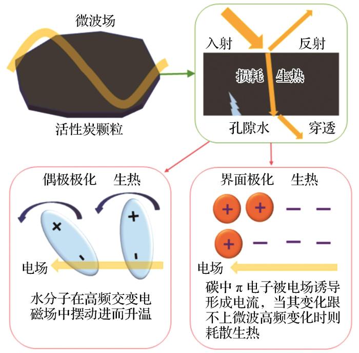 ... 水和活性炭均拥有很强的介电能力(Gaglianoa et al.,2021;Ellison et al.,1996,刘彦超等,2019),吸收微波的能力很强.水偶极子在微波场中每秒重新排列数万亿次,并在旋转的分子之间引起摩擦,这一过程导致在材料的整个体积内产生热量(Peng et al.,2015).活性炭的加热原理是碳材料中的π电子,会产生与电磁场同相传播的电流.由于电子不能与电场相位的变化相耦合,能量因麦克斯韦—瓦格纳效应(界面极化或麦克斯韦—瓦格纳极化)以热的形式耗散(Menéndez et al.,2010).这2种效应将微波能转化为热能,即直接对活性炭由内到外迅速升温,如图1所示.活性炭的多孔结构增加了微波的反射与散射,加强了微波能向热能的转化( Negi et al.,2021).污染物受高温被挥发或裂解,而水成为蒸汽也有助于清理并疏通孔隙. ...