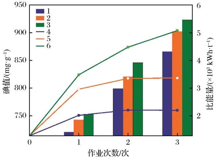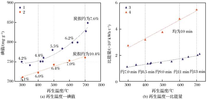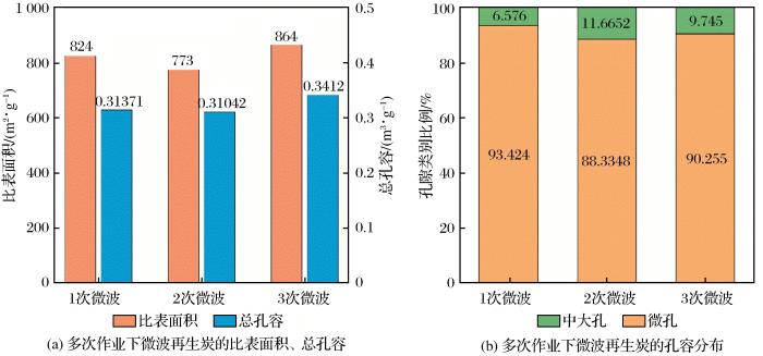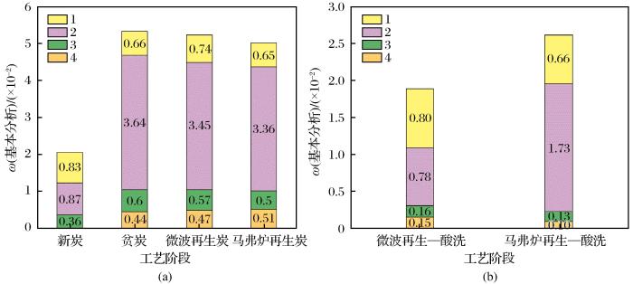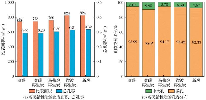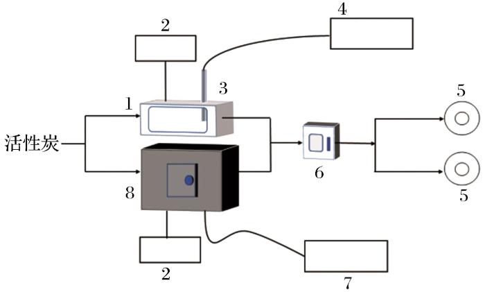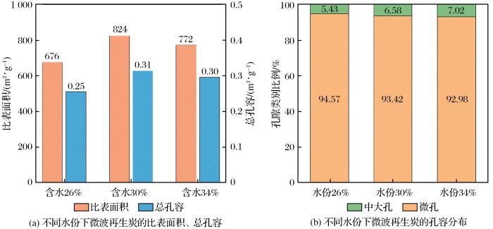 由于活性炭及其孔隙中的水具有良好介电性(炭为超热活性物质)(Shivanshu et al.,2021;檀素霞等,2006),且微波辐照可以不蒸干孔隙水直接加热活性炭本身( Sakemi et al.,2021),因而能量使用效率高、升温速度快。此外,孔隙水在间隙中部分电离并放电,将疏通孔道,增加活性。Bradshaw et al.(1998)研究表明在再生温度为650 ℃的条件下,通入适量水蒸气进行活性炭微波再生,能获得更高的再生活性及强度。浦燕新等(2021)进行微波再生活性炭研究,并开展不同载气条件试验,确定了最佳反应条件,即微波加热温度为500 ℃、加热5 min、氮气载气流量为1 L/min。然而,结合现场设备及安全生产成本,现场很难供给稳定的氮气及水蒸气,所以应探索微波再生在不加注气氛下的再生条件。同时,微波效率与活性炭介电能力有强相关性,活性炭的水份对活性炭的介电能力影响显著,应予以研究。