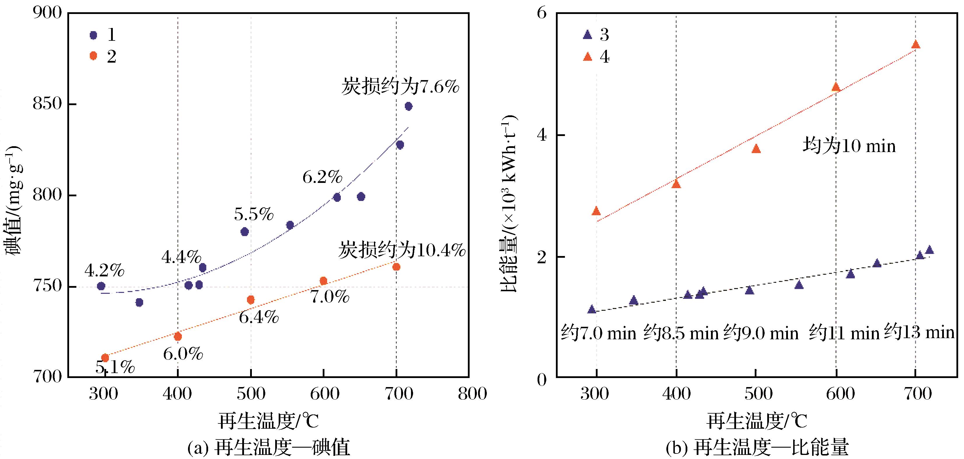 | 图3 再生炭碘值与比能量随再生温度变化 1.再生温度—碘值(微波);2.再生温度—碘值(马弗炉);3.再生温度—比能量(微波);4.再生温度—比能量(马弗炉) |