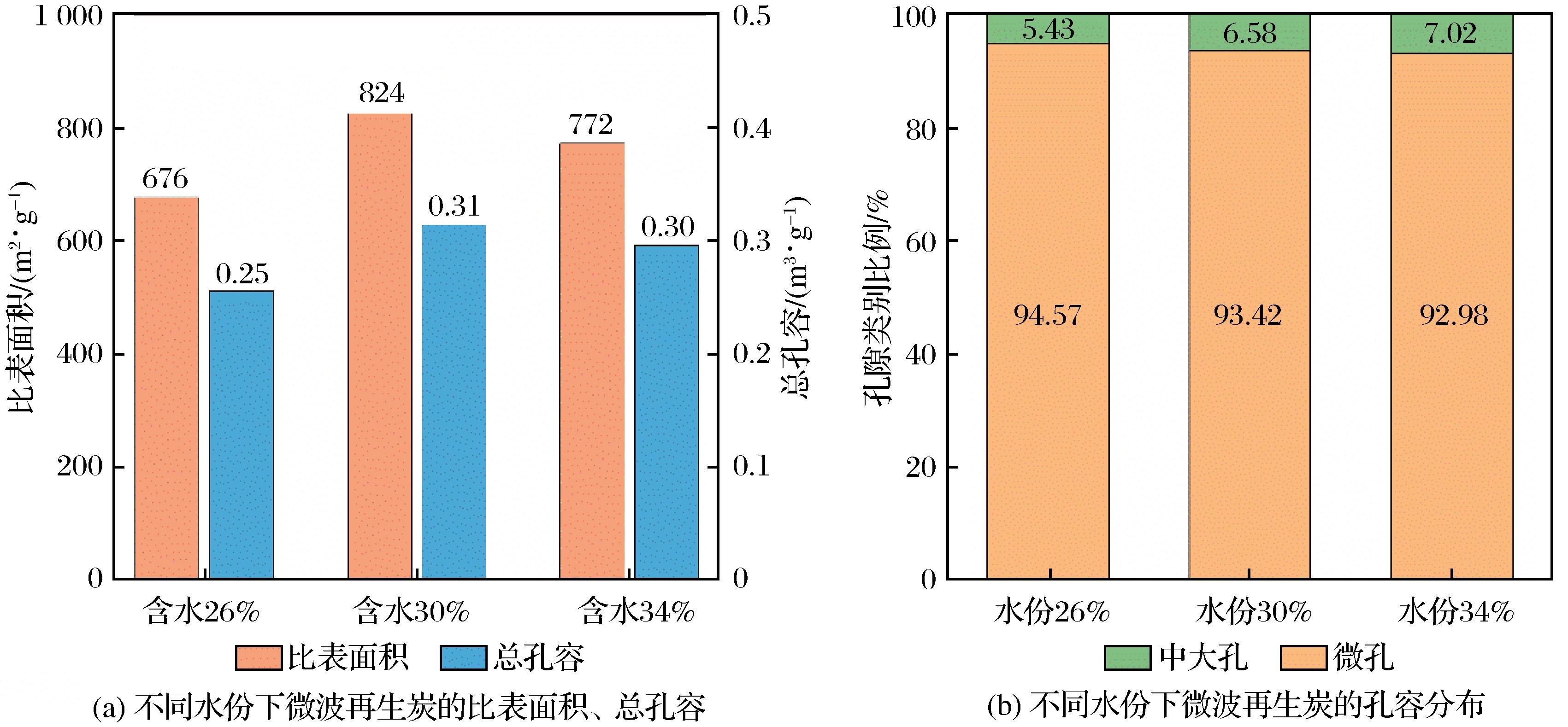 | 图8 不同水份下微波再生炭的比表面积、总孔容与孔容分布 |
