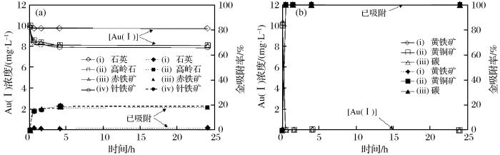 ... 碳质金矿浸出时,矿石中的多种物质均可表现出不同程度的“劫金”能力.Adams et al.(1996)发现碳质金矿中“劫金”物质有多种类型,如:非晶态碳、绿泥石、黄铜矿,以及层状硅酸盐矿物(叶蜡石、高岭石、云母和伊利石)等.在此基础上,Sitando et al.(2019)研究了不同类型“劫金”物质的“劫金”能力.研究发现,不同类型“劫金”物质的“劫金”能力差异明显,图1为Au(I)在氧化矿/硅酸盐矿物和硫化矿/碳的吸附结果(Sitando et al.,2019),可以看出石英只吸附了1.7%的金,而针铁矿、高岭石和赤铁矿吸附了约18%的金,黄铁矿、黄铜矿等硫化物和碳质物具有高度“劫金”性,金可在半小时内被全部吸附.该研究表明,虽然矿石中能够“劫金”的物质种类较多,但在有碳质物存在的情况下,其他物质的“劫金”能力往往被忽略.目前对于该现象产生原因的研究较少,对其进一步研究有助于碳质金矿中金浸出环节机理的研究. ...