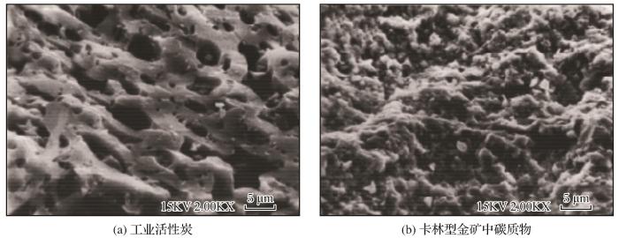 ... 然而,更多的研究(Stenebraten et al.,2000;张跃东,2011)发现孔隙结构是吸附金氰络合物的主要原因.为了观察这些碳质物与活性炭结构的关系,Tan et al.(2005)利用显微方法(图2)和X射线衍射对斯塔威尔金矿的矿石中提取碳质物进行研究,发现天然碳质物主要是晶体石墨(六角形晶体石墨结构单元)到一些微小的半结晶石墨或非晶态碳,放大观察可见这些碳质物具有显著的孔隙结构,N2吸附—解吸滞后曲线测定结果表明这些碳质物的总孔隙体积为76 mm3/g,主要为大孔隙.Miller et al.(2016)对一种工业活性炭和卡林型金矿中的碳质物进行了扫描电镜(SEM)观察,如图3所示.结果显示:工业活性炭具有均匀的大孔表面,而卡林型金矿中的碳质物也具有非晶态孔隙结构.工业活性炭表面的微孔直径大多在2~50 nm之间,比表面积通常可达500~1 500 m2/g,从矿石中分离出的碳质物碳含量为40%,比表面积相对较小,为42.7 m2/g. ...