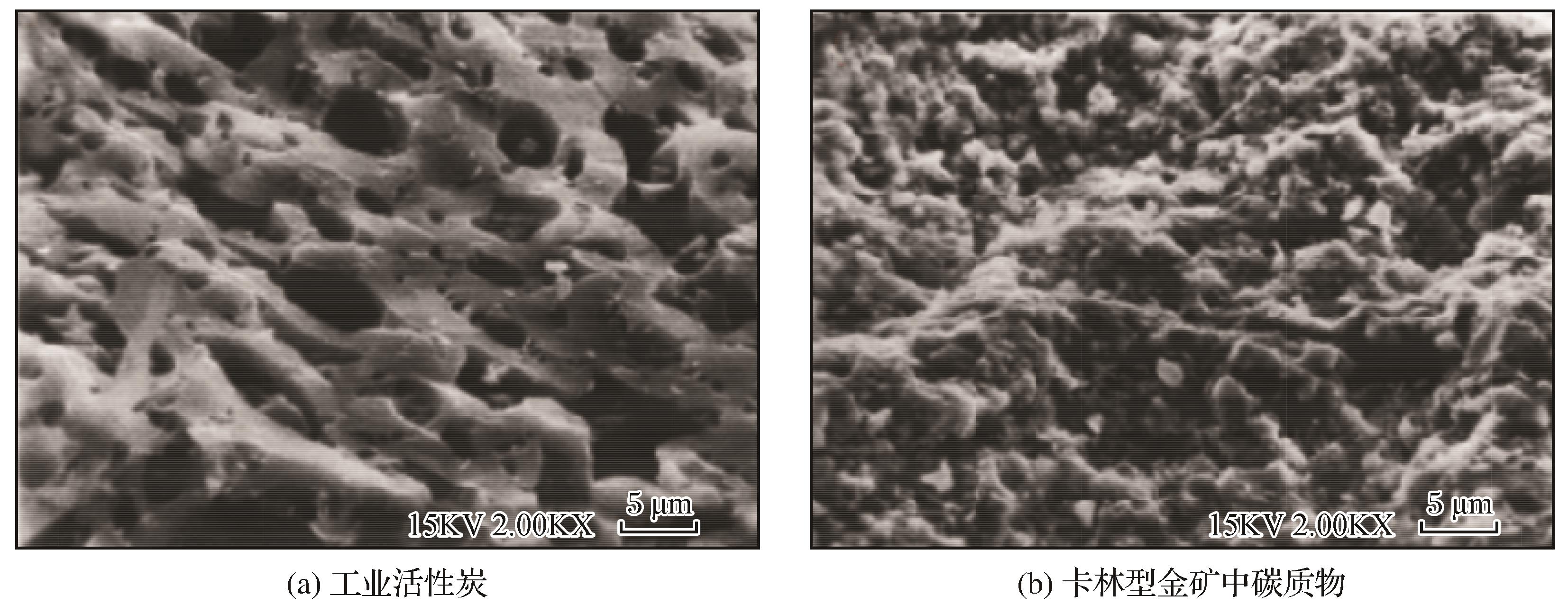 | Fig.3 SEM images of carbonaceous matters in commercial activated carbon and Carlin type gold deposit |