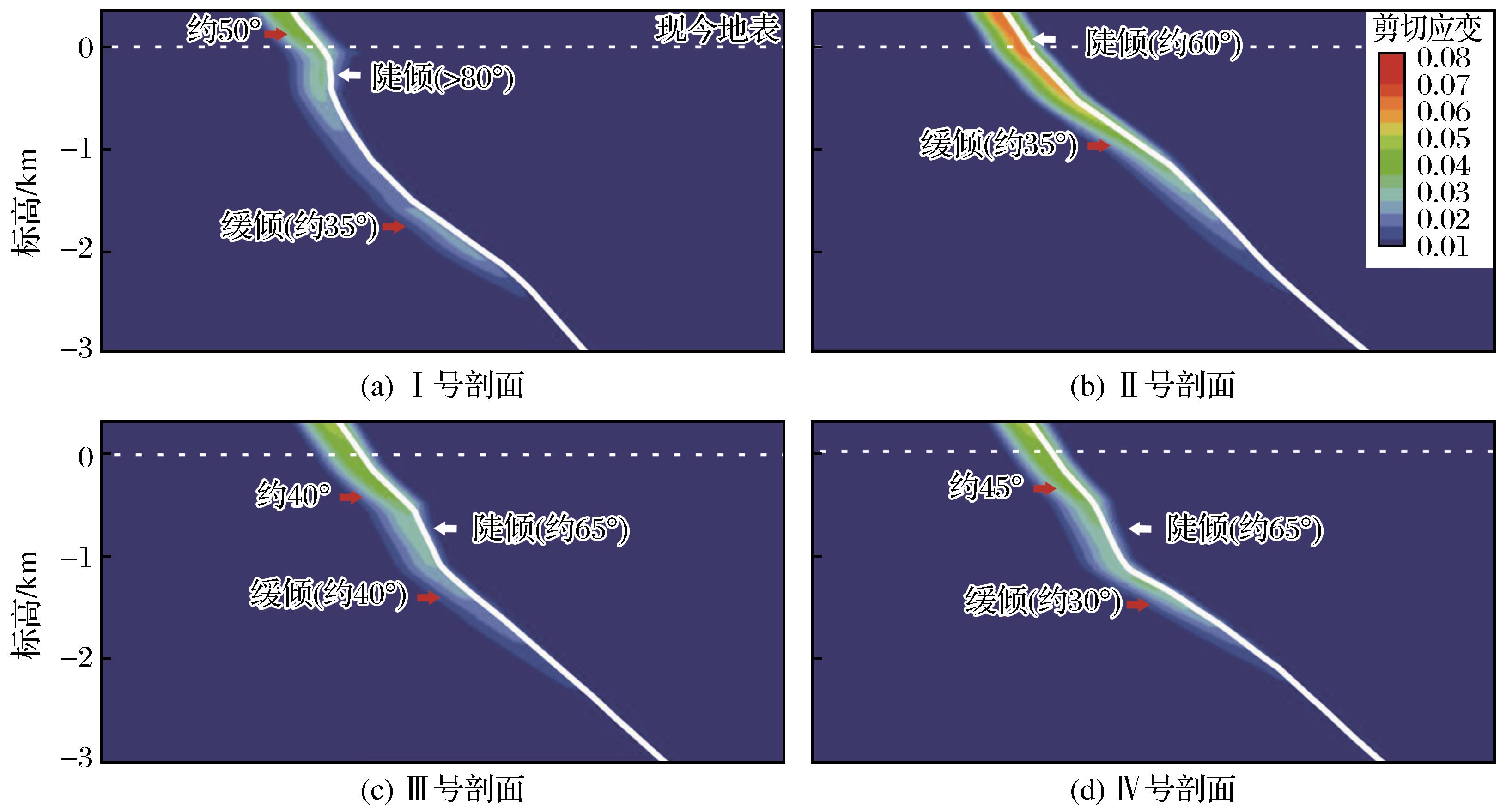 | 图8 体积压缩量为2%时不同典型剖面剪切应变图 |