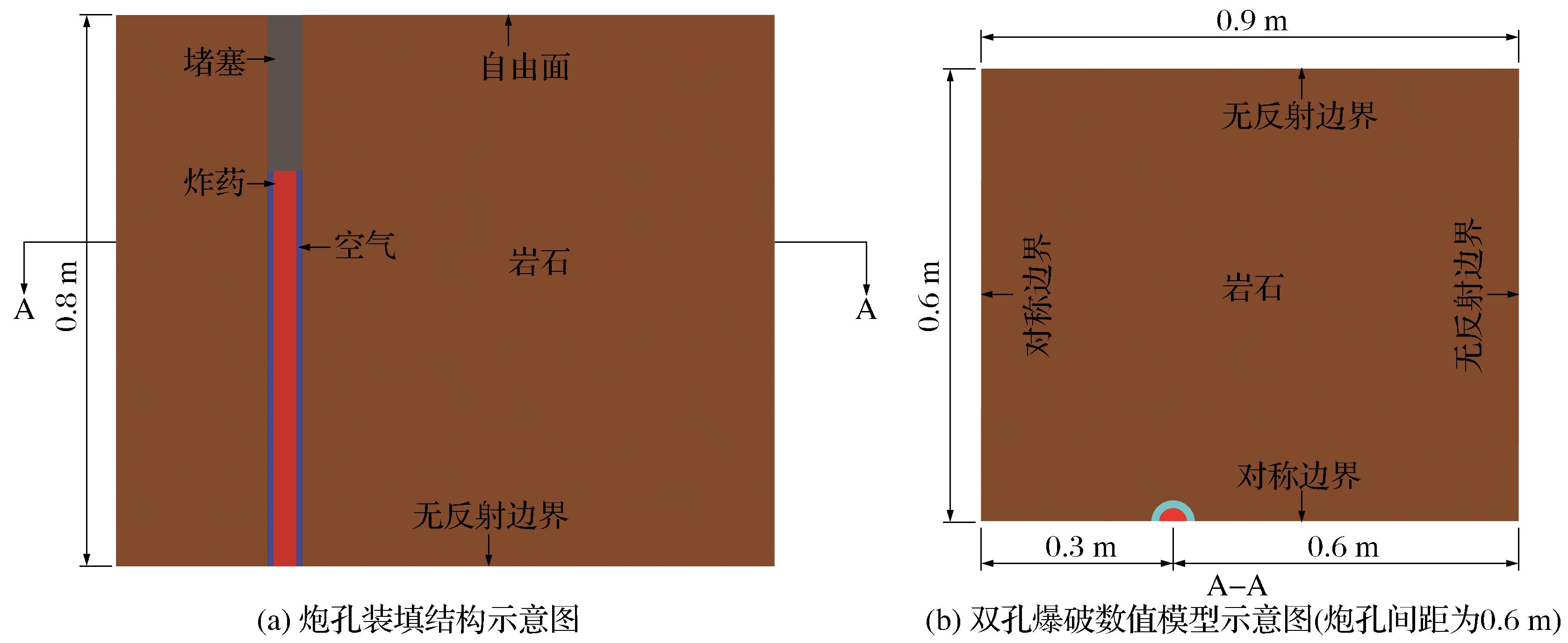 | 图4 炮孔装填结构与双孔爆破数值模型示意图(炮孔间距为0.6 m) |