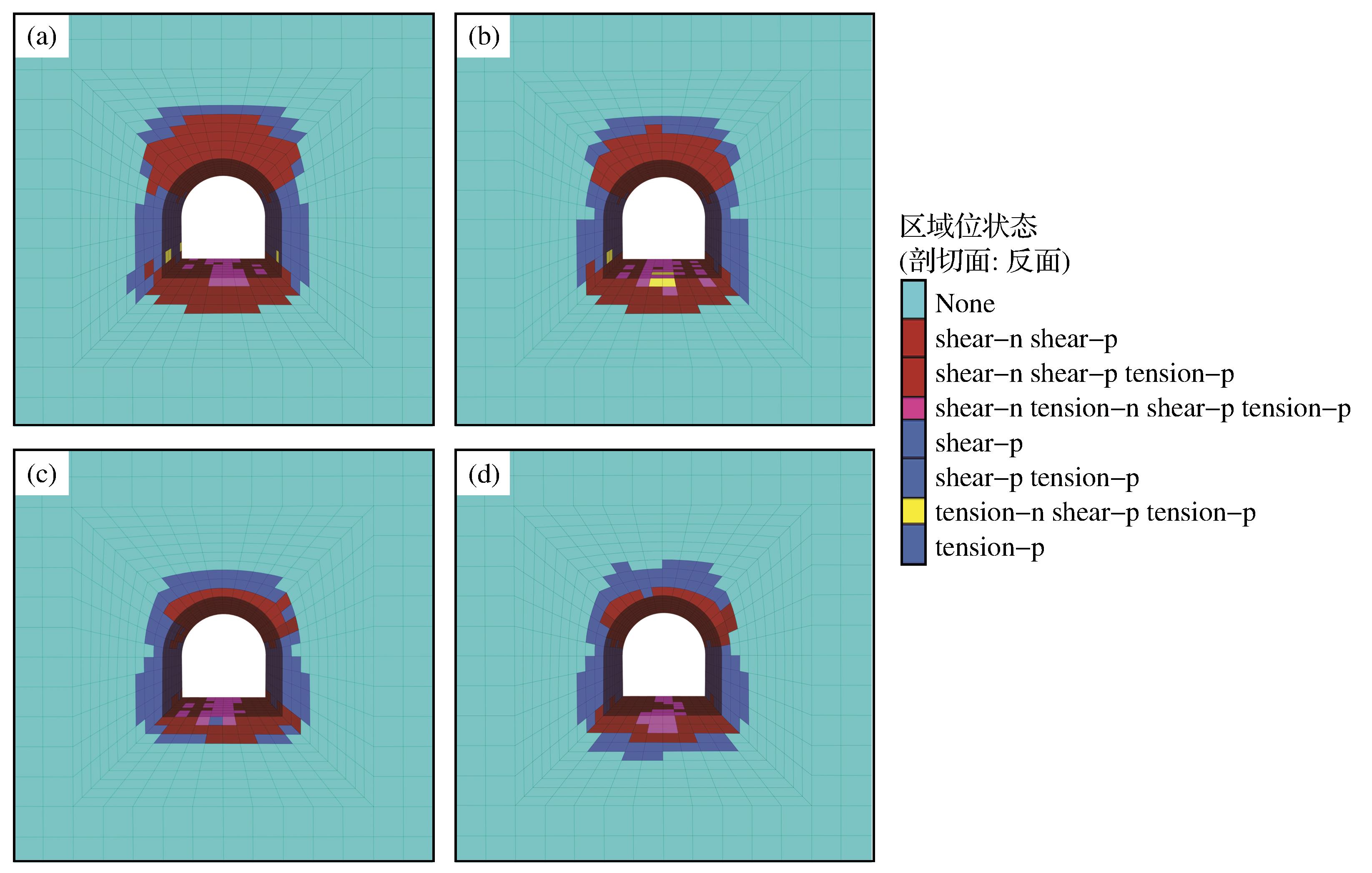 | 图6 不同支护条件下巷道塑性区分布云图 (a)巷道开挖;(b)锚杆支护;(c)锚杆—混凝土支护;(d)锚杆—混凝土—金属网支护 |