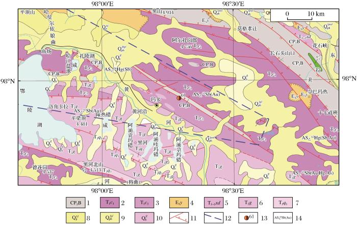 1.石炭纪—中二叠世布青山群;2.早三叠世昌马河组下段;3.早三叠世昌马河组上段;4.古近纪雅西措组;5.早—中三叠世下大武组;6.中三叠世甘德组;7.晚三叠世清水河组下段;8.第四纪更新世砾岩、砂砾岩夹砂岩;9.第四纪更新世冰水堆积的砂砾石层;10.第四纪全新世腐植泥、黏土和粉砂沼泽沉积;11.具构造分区意义的断裂带;12.成矿区带划分边界;13.锑金矿点及编号;14.地球化学异常组合编号