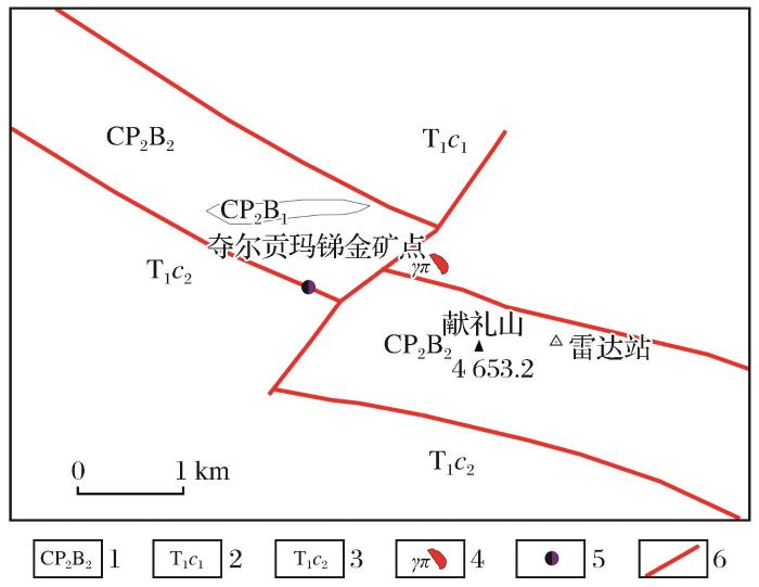 1.石炭纪—中二叠世布青山群;2.早三叠世昌马河组上段;3.早三叠世昌马河组中段;4.花岗岩岩体;5.锑金矿点;6.区域构造线