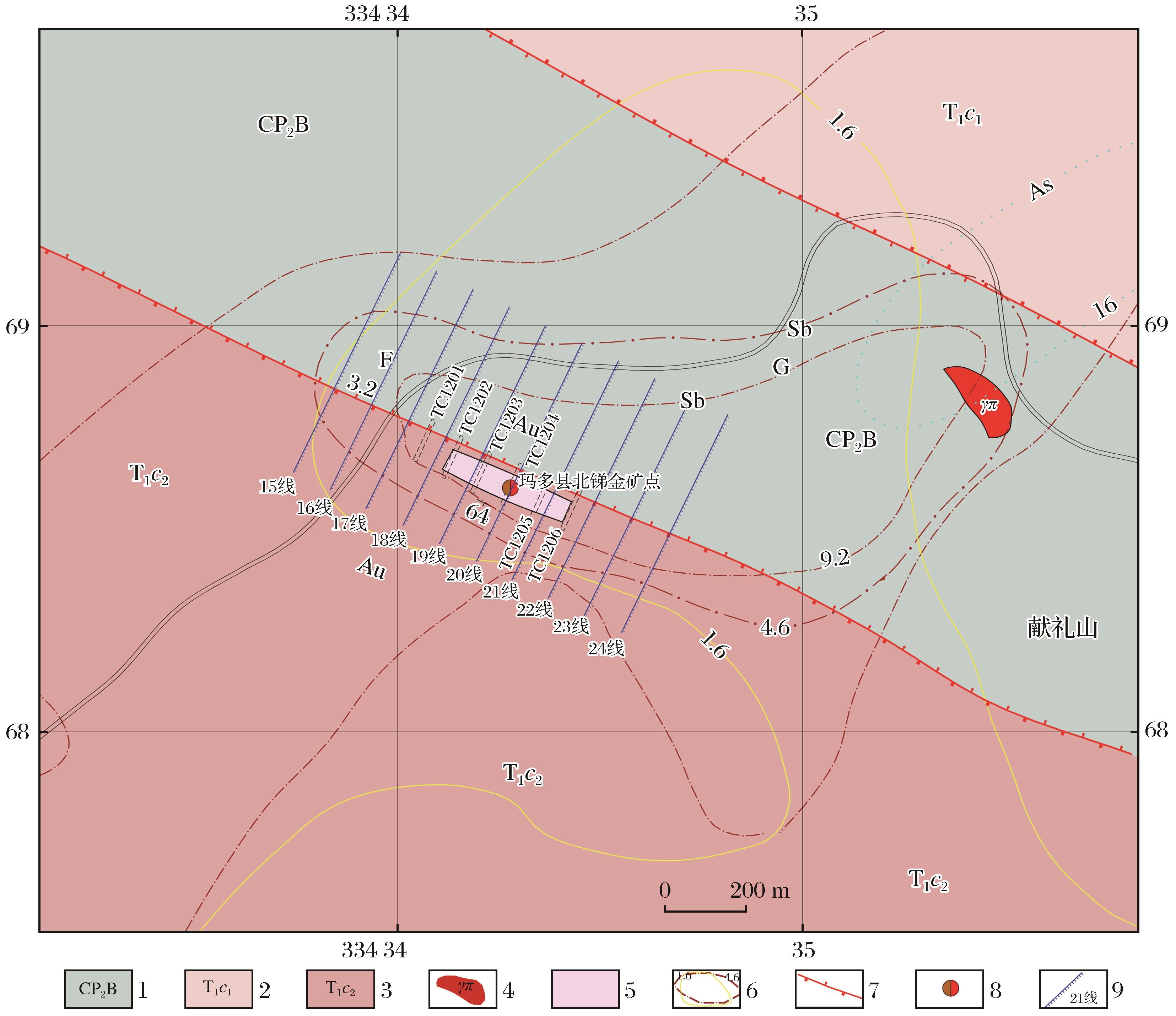 | 图2 夺尔贡玛测区地质概况及高密度电法工作部署图 1.石炭纪—中二叠世布青山群;2.早三叠世昌马河组上段;3.早三叠世昌马河组中段;4.花岗岩岩体;5.锑矿化脉;6.锑金元素化探异常;7.具有分界意义的断裂;8.锑金矿化点;9.高密度电法测线 |